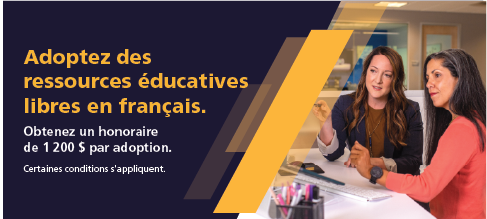Des pédagogues de partout en Ontario ont partagé leur expertise et se sont investis pour élargir l’offre des ressources et des services en français offertes par eCampusOntario. Enrichissez votre enseignement grâce à ces REL en français conçues spécifiquement pour le corps enseignant du postsecondaire en Ontario. Profitez de cette opportunité et adoptez des REL dans vos cours!